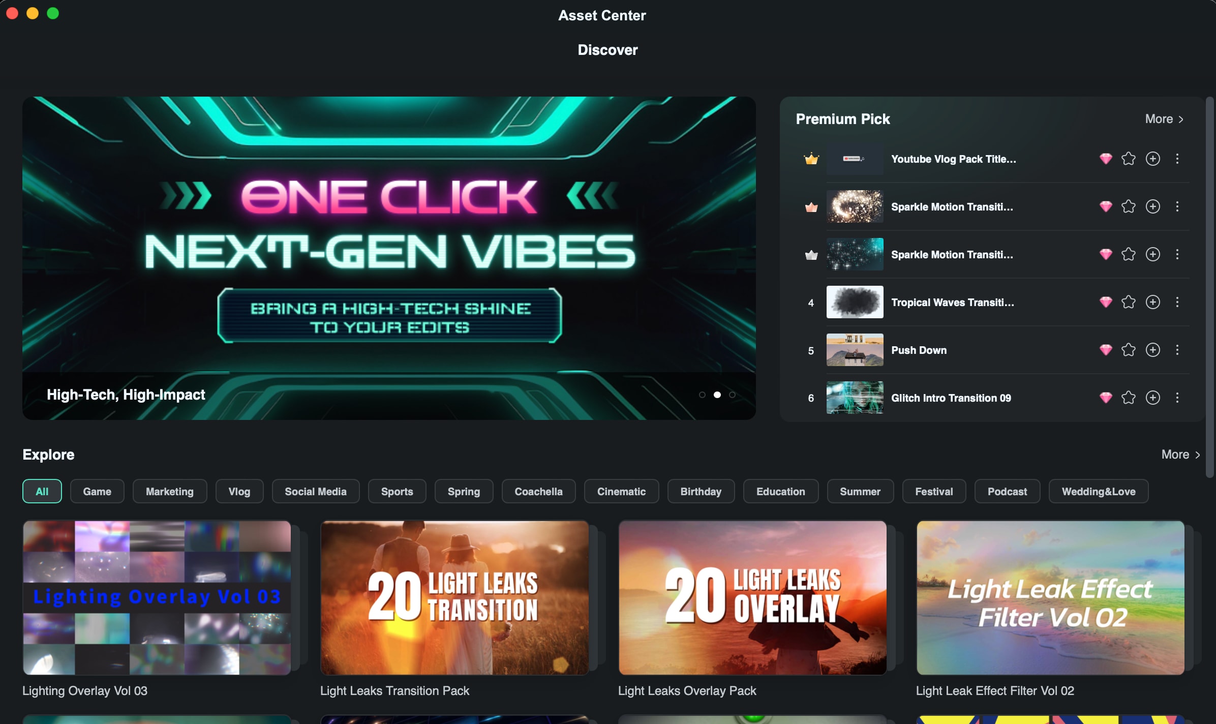 Центр ресурсов Filmora предоставляет доступ к богатой коллекции креативных ресурсов, предназначенных для улучшения ваших видеопроектов. Это своего рода рынок внутри Filmora, где собраны тематические наборы, популярные элементы, эффекты, титры, стикеры и другие полезные материалы. Функция помогает легко находить новые, трендовые и специализированные ресурсы, расширяя возможности стандартной библиотеки.